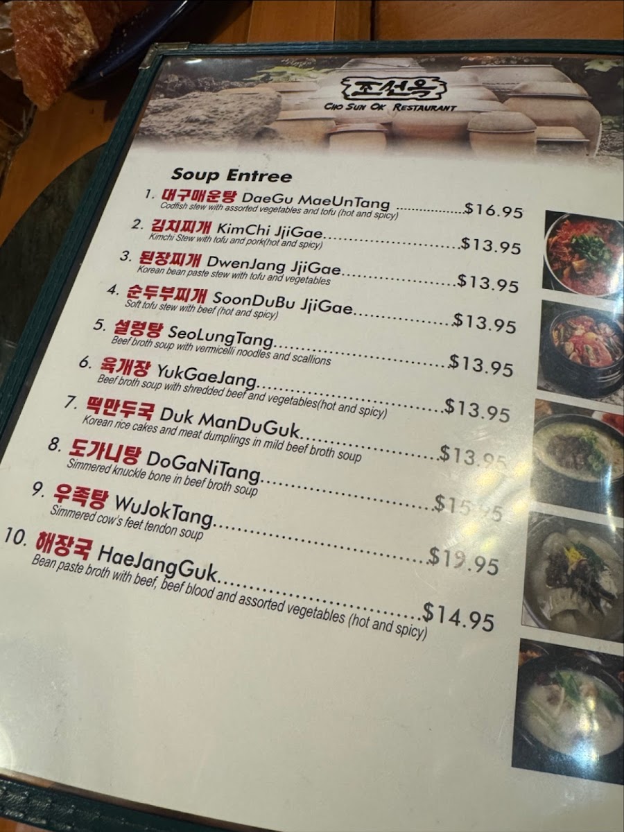 “ Although the service is a 0/5 (the ajuhma’s here don’t gaf), the food is a 5/5 hahaha The inside isn’t very spacious but my friend and I were able to get seated right away. We were originally going to order some cold noodles but since they ran out, we ended up getting the Beef SunDuBu JiGae and the Galbi. The banchan here is fantastic- every dish tasted so fresh and delicious. The sudubu was very savory and flavorful, it’s one of the best ones I’ve had in a while. As for the Galbi, the cut of meat is thicker than all the Korean restaurants I’ve ever been to but it’s also one of the best one’s I’ve had. Super tender and juicy- I still think about it from time to time haha. That being said, if you are expecting good customer service (even just OK/mid), this is not the place. Cho Sun Ok is strictly to just eat good Korean food and leave when you’re done. Note: The restaurant says it closes at 9:30 and let me tell you, the ajuhmas and cooks are wiping down tables and putting up chairs by 9:20 so if you’re coming in 30 minutes before closing, I’m wishing you the best of luck ”